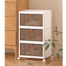 写真で見るより少々プラスチック感が強いですが、正面から開ける事が出来る収納としては使いやすいです。