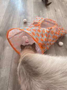 うちの猫様が気に入りすぎて毎日遊んでます。猫の好きなカシャカシャ袋の音がするし、ネズミもついてるし、玉も3つ付いてて遊びどころがたくさんあります。今回1番買って良かった!もう少し落ち着いた色のやつも欲しいです。