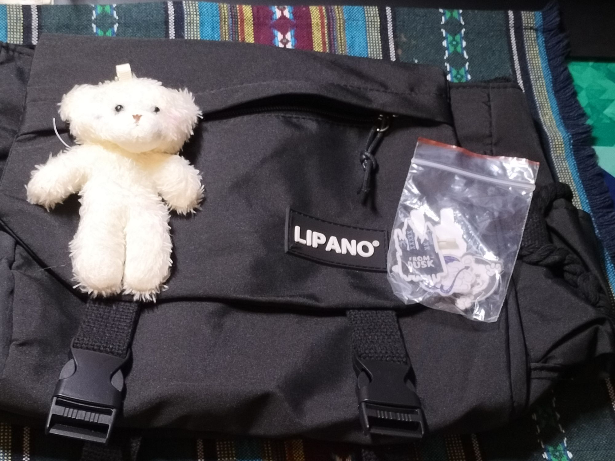· 生地薄め、小さめな可愛いバッグ、取って付属のバッジを付けたら使えそう、ぬいぐるみは可愛い、安価でよく作られたバッグ、多くのポケット