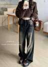 on% closetパンツ|アメリカンヴィンテージ・ウォッシュ加工・ストレートデニムパンツ・ハイウエスト・スリム効果・ワイドレッグ・ロングパンツ・秋