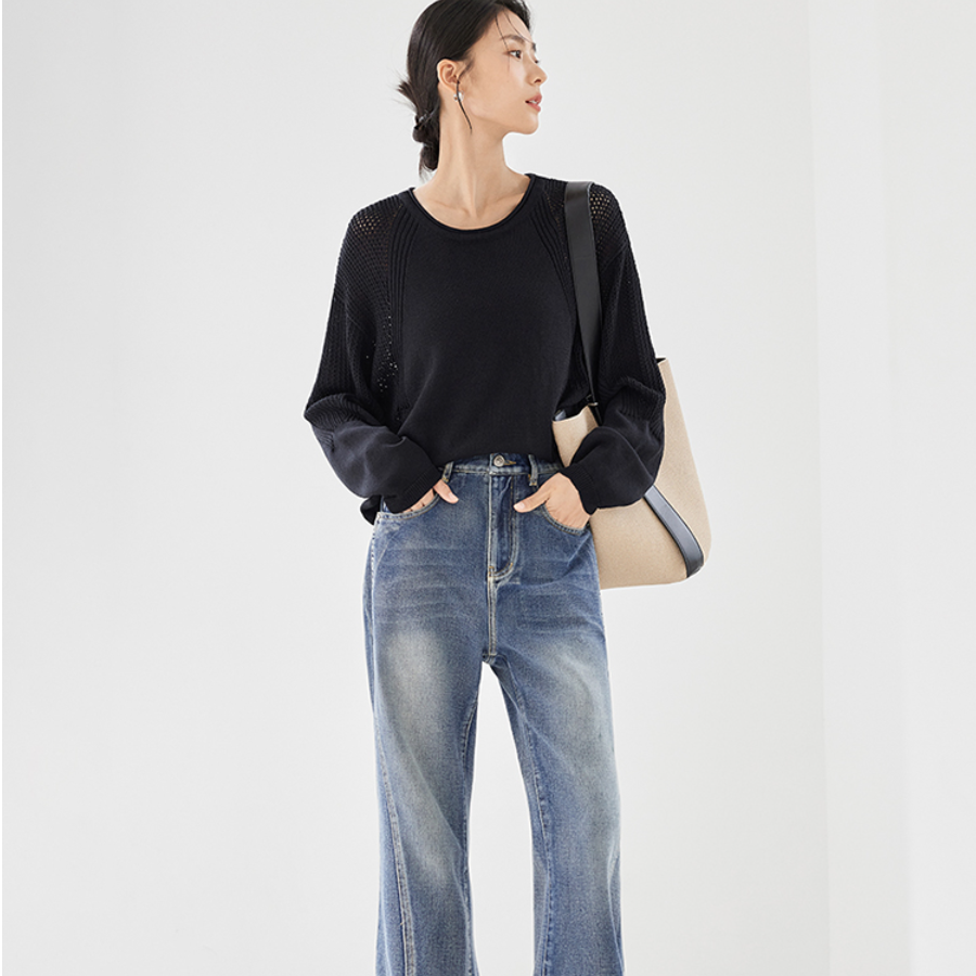 このパンツはハイウエストデザインがスタイルを引き立て、スリットとフレアパンツのシルエットが美脚効果を発揮します。デニム素材で、2024年秋の新作としてスリム効果もあり、ロングレングスがさらに魅力を引き立てています。履き心地も良く、どんなトップスとも合わせやすく、大変満足しています。