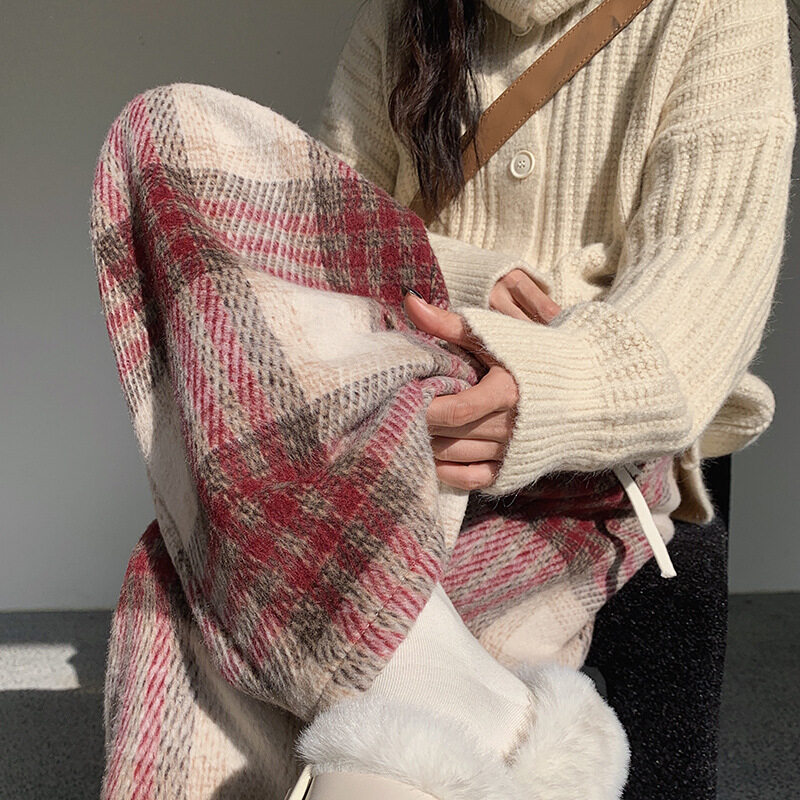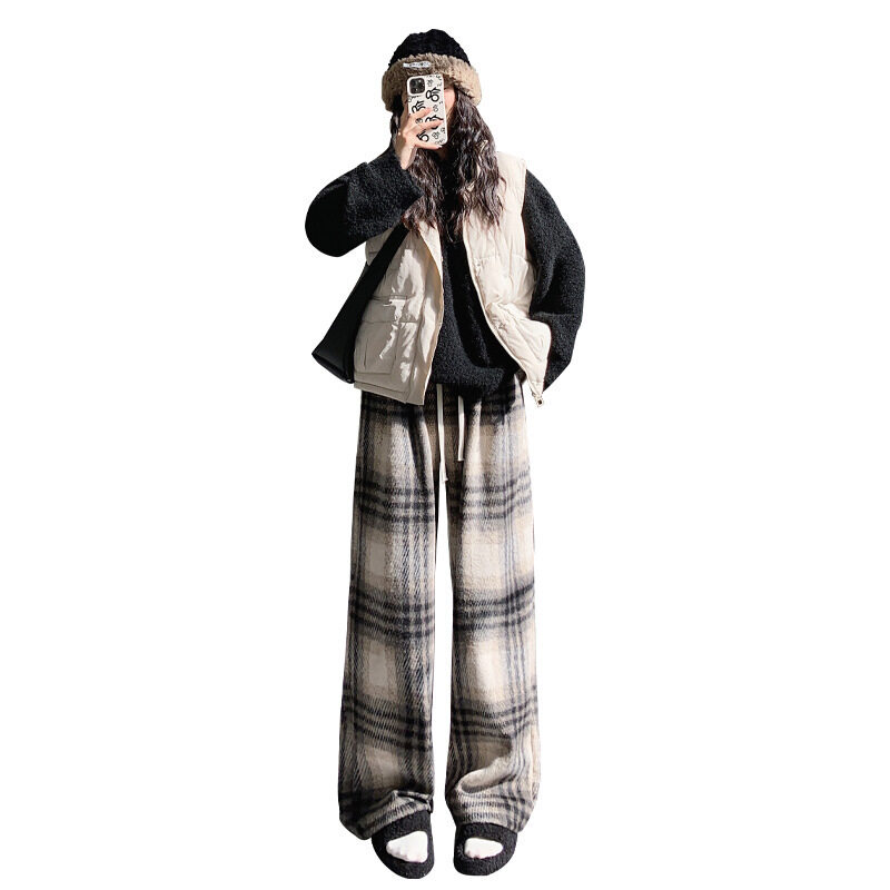 パンツ|レトロ・ウール混紡・チェック柄・スリムフィット・ロング丈・カジュアル・リラックス・ストレート・ドレープ感・裏起毛・ニット・ワイドレッグ