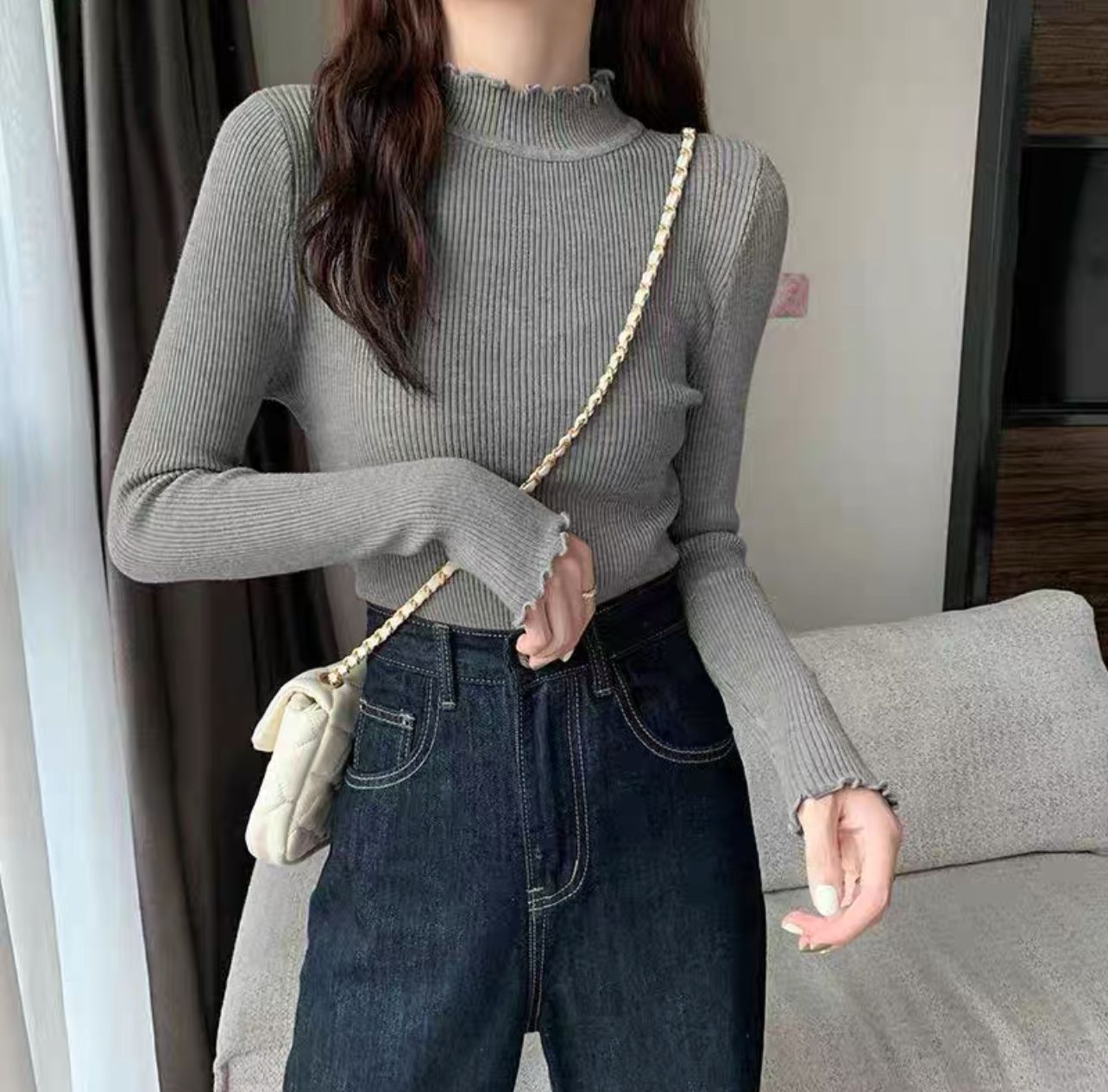 Yippeeニットセーター|タートルネック・長袖・無地・秋冬用・スリムフィット・フリル・おしゃれ・ストレッチ