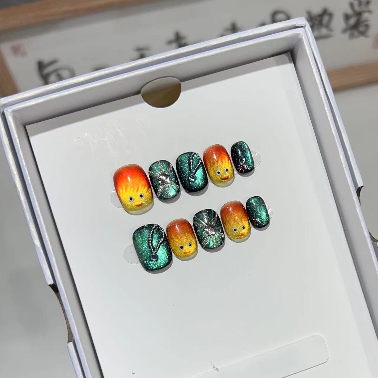 ネイルチップ|手作り・カルシファー・手描き・着用ネイル・かわいい・小悪魔・マグネット・四つ星・スチールビーズ