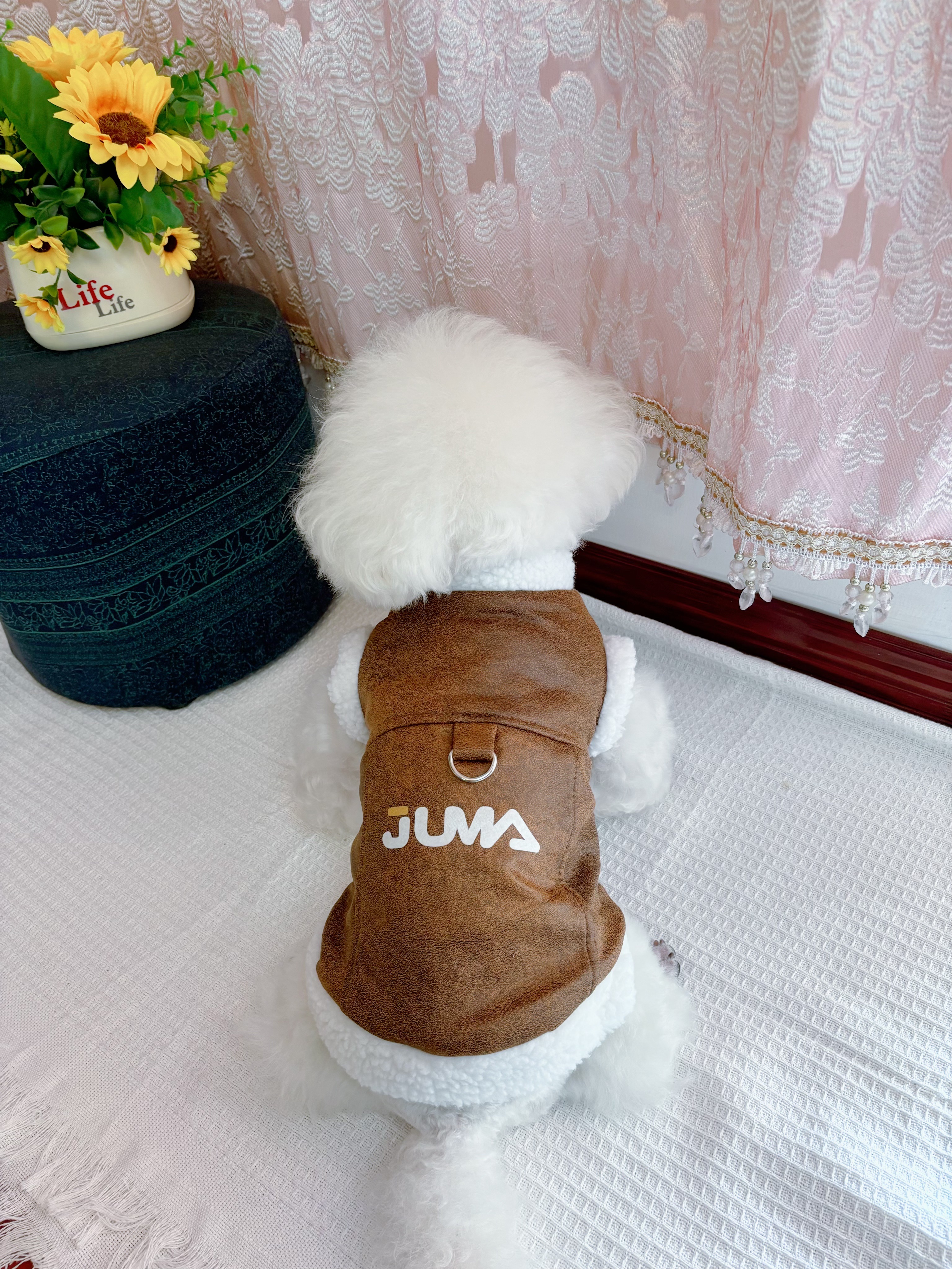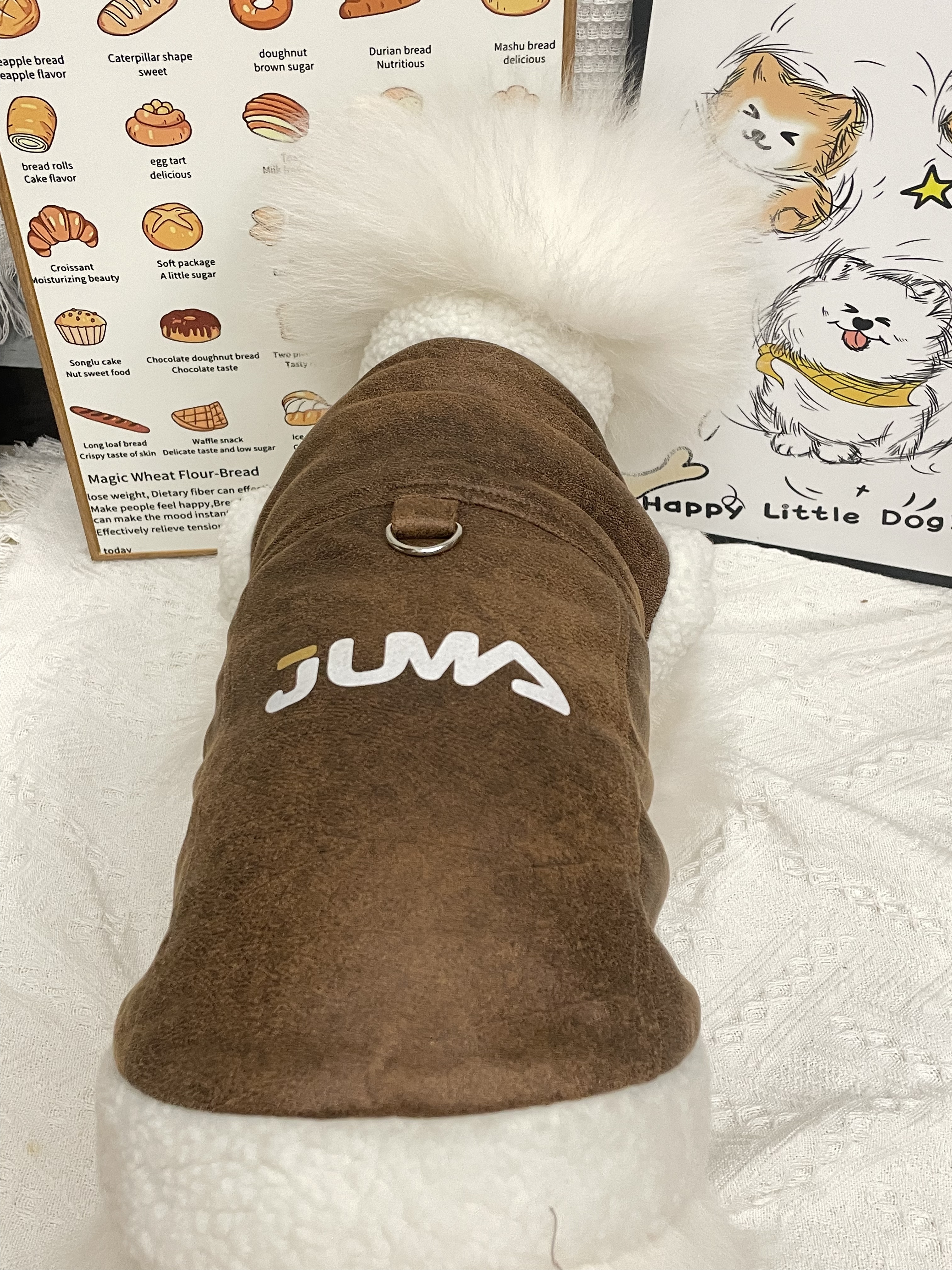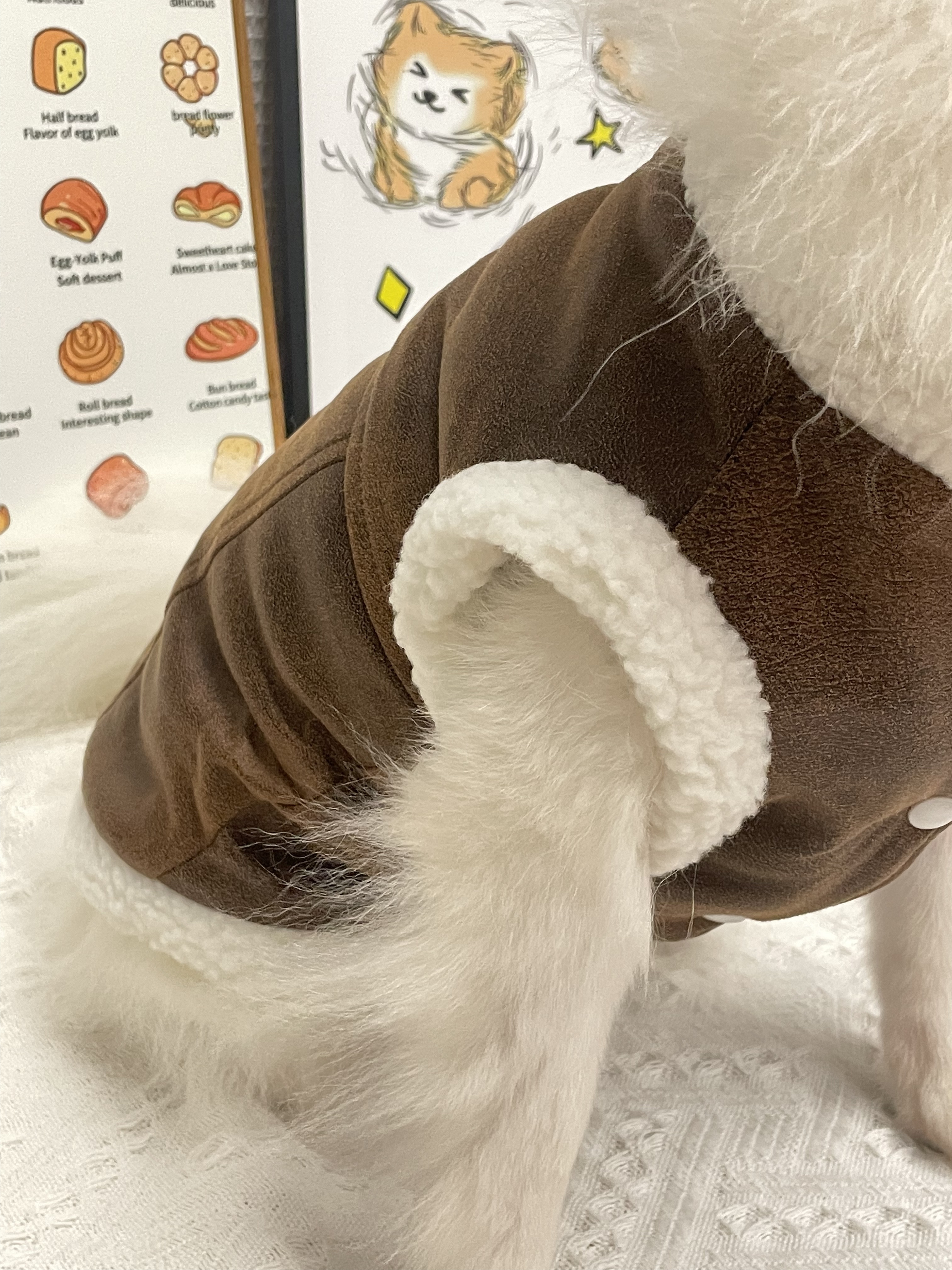 ブラウンは本当に秋冬にぴったりです!スエードはとてもクールで、犬が着るととてもかっこいいです。素材はフリースで厚く、寒さ対策に非常に優れています!冬に着ても全然寒くありません!