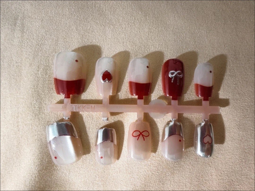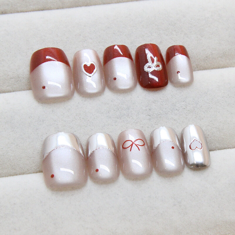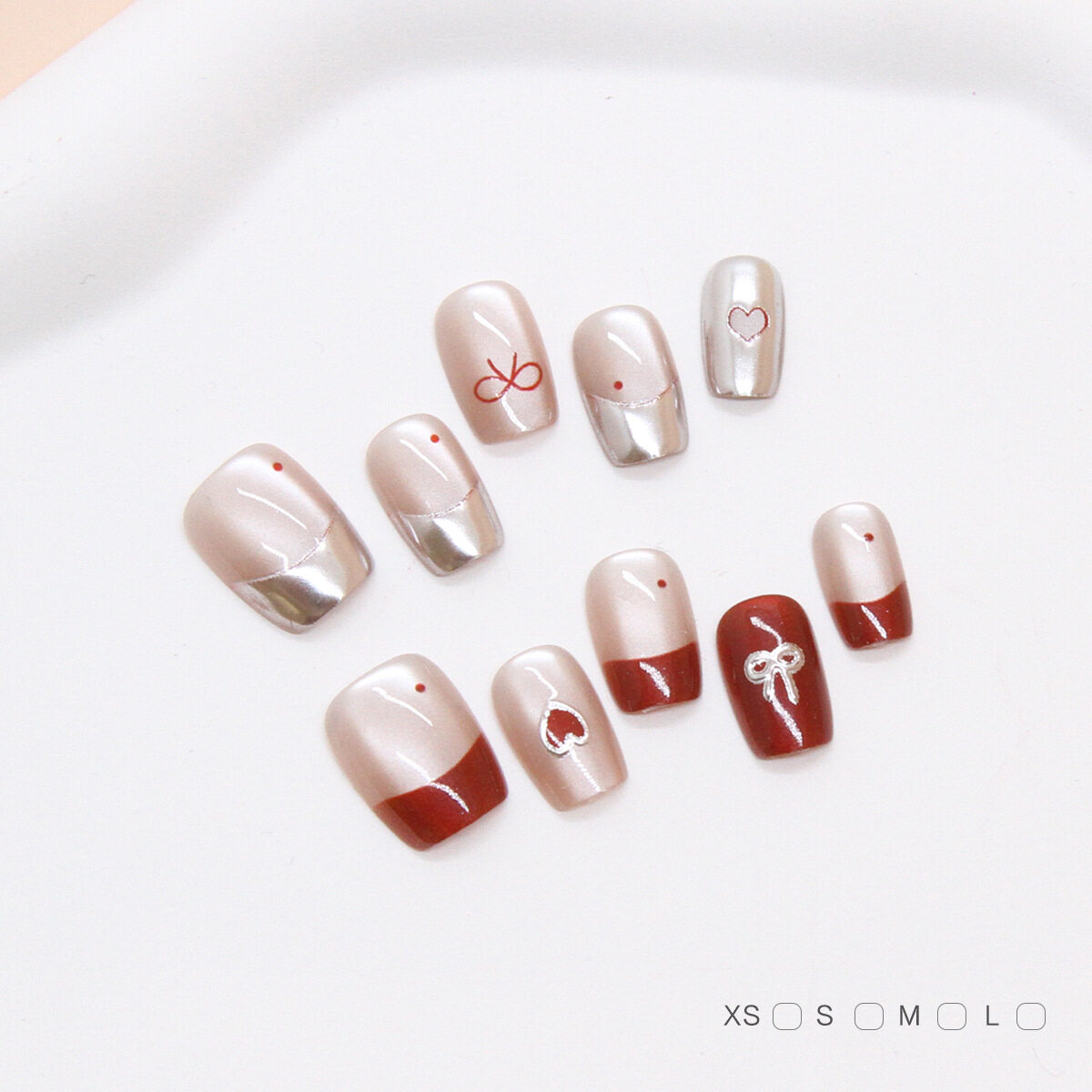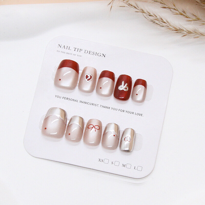 【10枚】ネイルチップ|手作り・立体・フレンチ・ 猫目・キャットアイ・ハート・リボン・ショート・サイズ別・雰囲気・肌映え・ピンク・赤