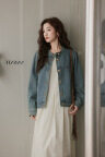 UniqueGirlデニムジャケット|レディース・ラウンドネック・ウォッシュ加工・ヴィンテージ風・春秋用