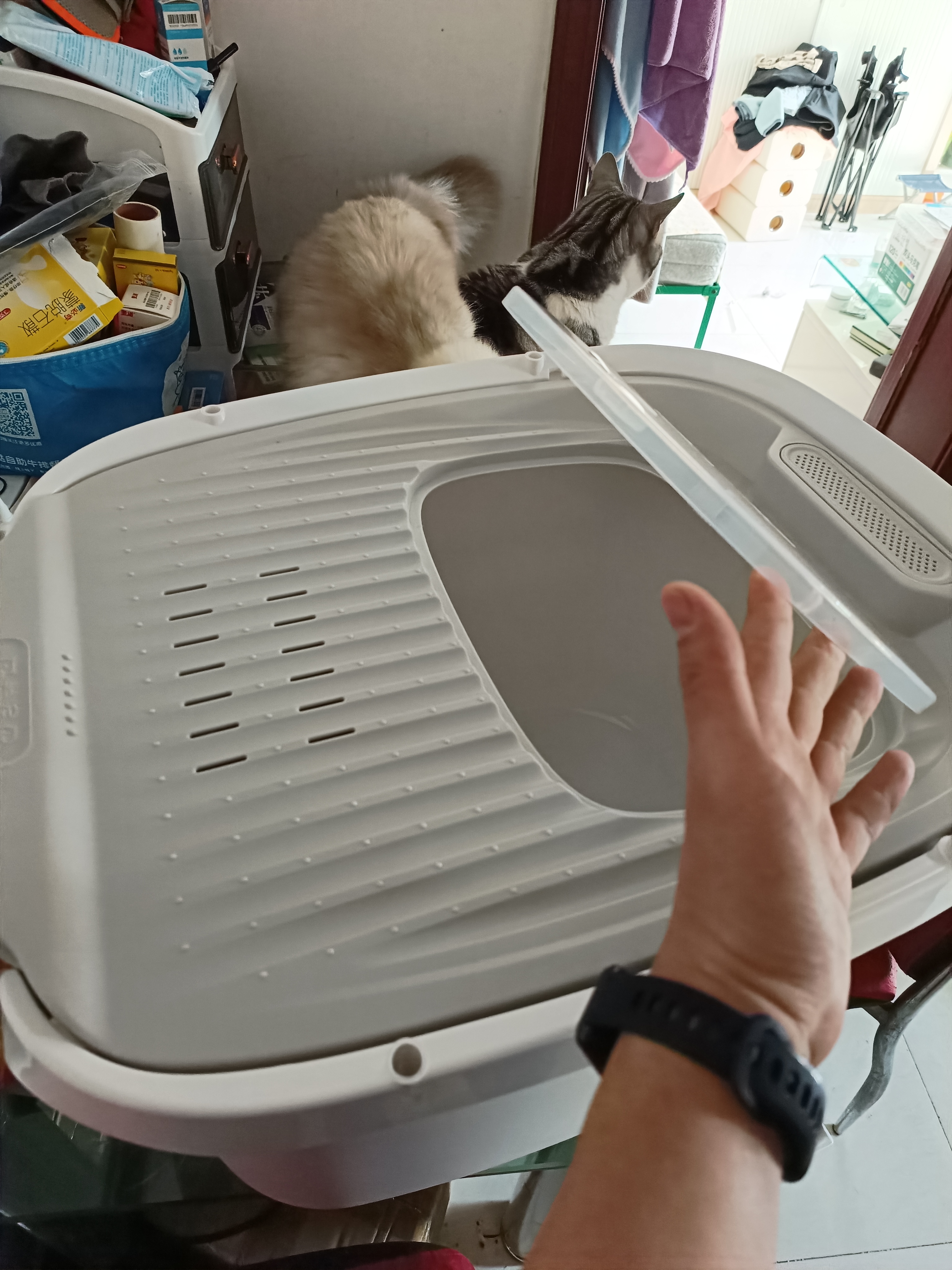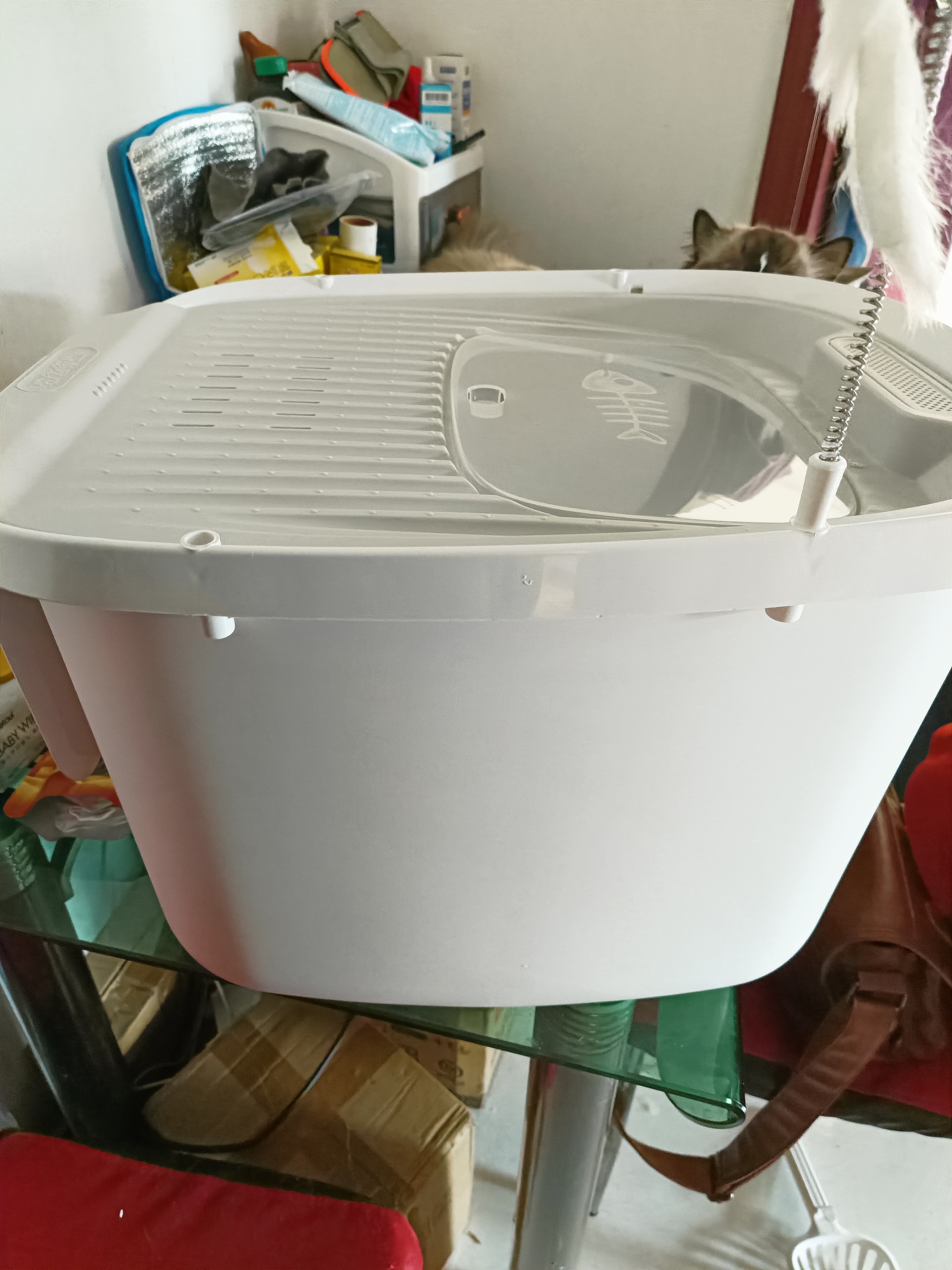 この洗面器はとても大きいです。デザインも良く、前から出入りでき、入口はシングルインとダブルインで調整できます。上記の設計により、砂が漏れ、砂の持ち込みを防ぐことができます。シャベルの中空は少し大きいですが、横に置けるデザインでとても便利で、上部には猫の立ち上がりを促す猫じゃらし棒も付いています。全体的にとても良いです、満足です。