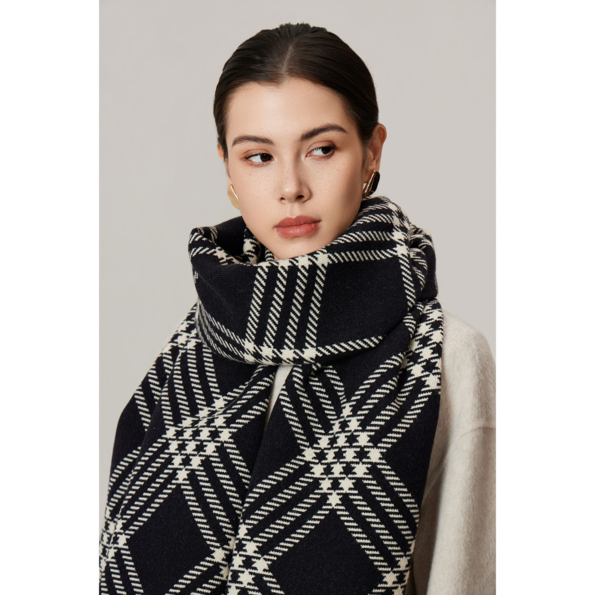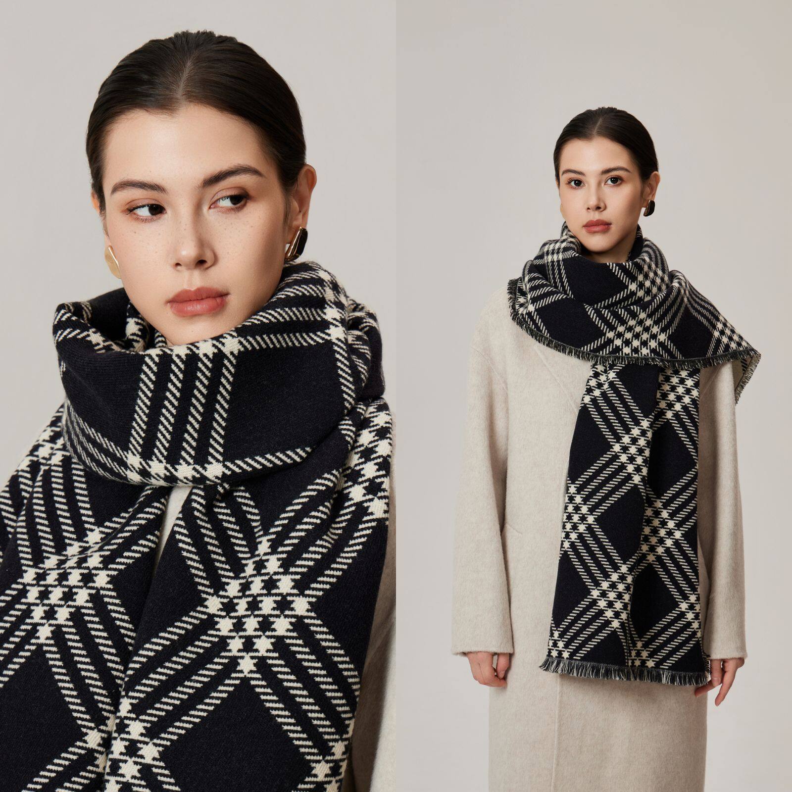 マフラー|包芯糸・両面斜文織り・フリンジ付き・格子柄・長め・大判ストール・ふんわり感・あったか・秋冬新作|undefined